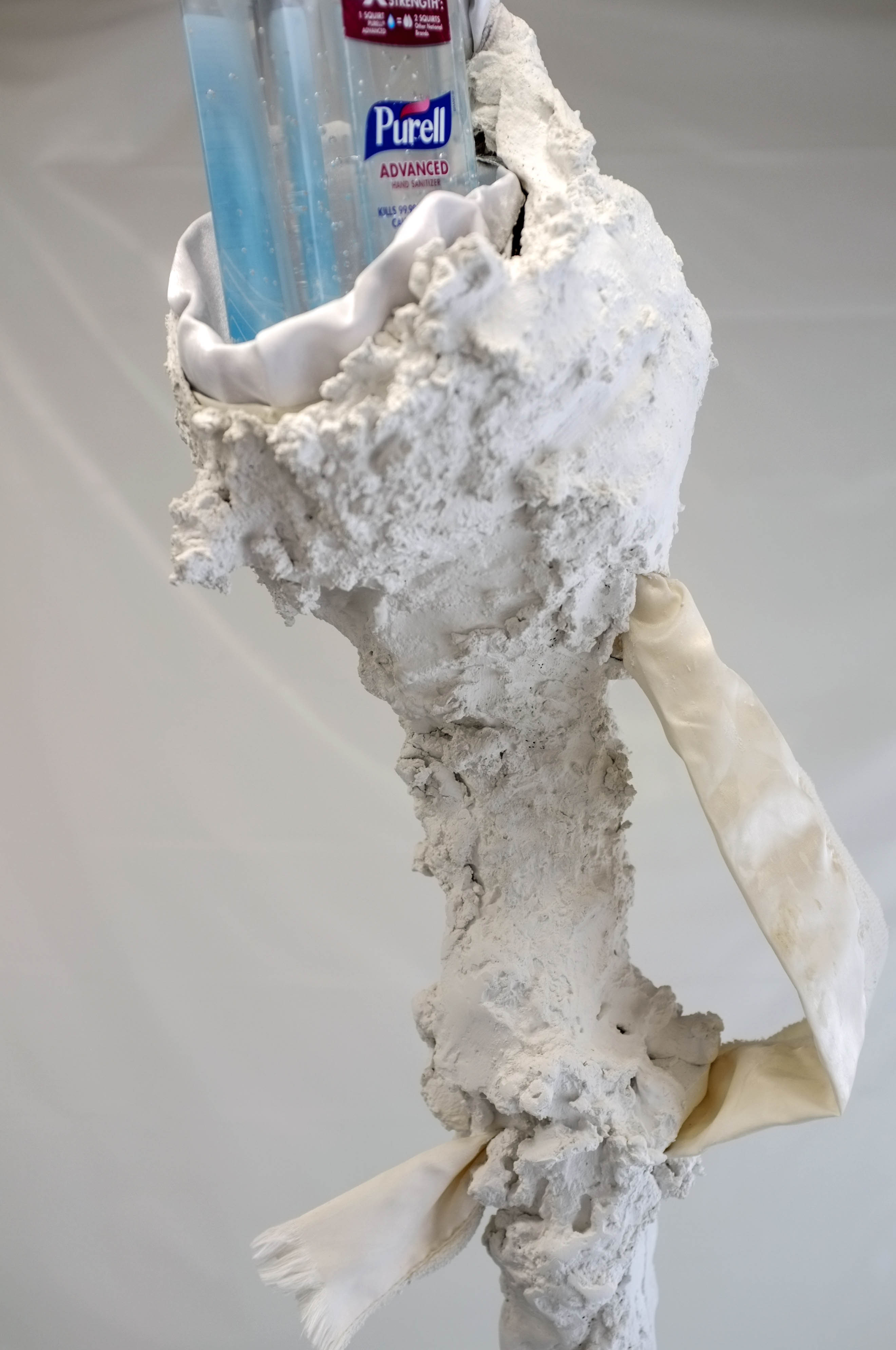 Be it the readymade object of hand sanitizers (or wet-wipes), cradled by the fluid slop of now static plaster, or the Artschwagerian exactitude of everyday consumables (and their leftovers), both force a culture onto an otherwise resistant materiality. It doesn’t matter if the intentions deployed are counter or complementary, as both already overlay an anthropocentric frame onto what is confused as a material’s “materiality”, or in Kaifeng Chun’s case, lack thereof: an almost phobic conflict in the discourse toward materiality in artistic production. Each answer, and in answering, particulate not only their material relations, but future orientations onto sensorial relation, itself.