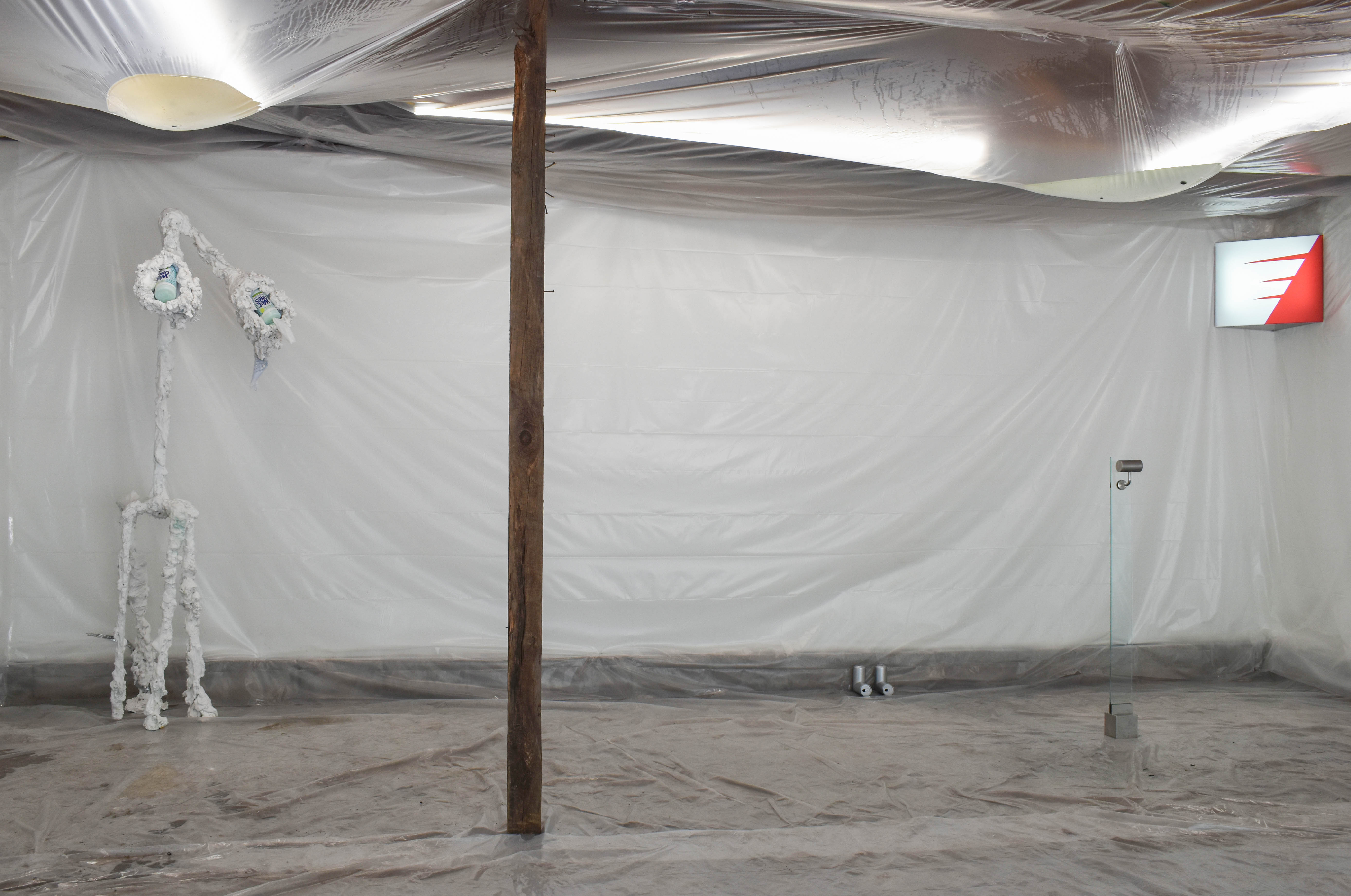 Joe Smith could be said to literally culture objects from otherwise dislocated materials. From soaked blankets that seem to be teeming with a threatening materiality, to particulates carried in the air (air fresheners), Joe Smith continues the legacy of material innovation through its criticism. In the present, this is demonstrated by a confounding juxtaposition of Giacometti-esque figures, bejeweled by industrially designed sanitation products. The result, to me, seems to demonstrate a material contradiction that is only justified by a cultural literacy of what is “raw”, “infectious” and “clean”, already inscribed onto a then reduced materiality. The double contradiction in this particular exhibition, is the environmental tension of the exhibition space itself becoming a material (the garage gaining a further garage-ness due to aspects of leakiness and/or the often improvisational nature of repair in domestic settings).